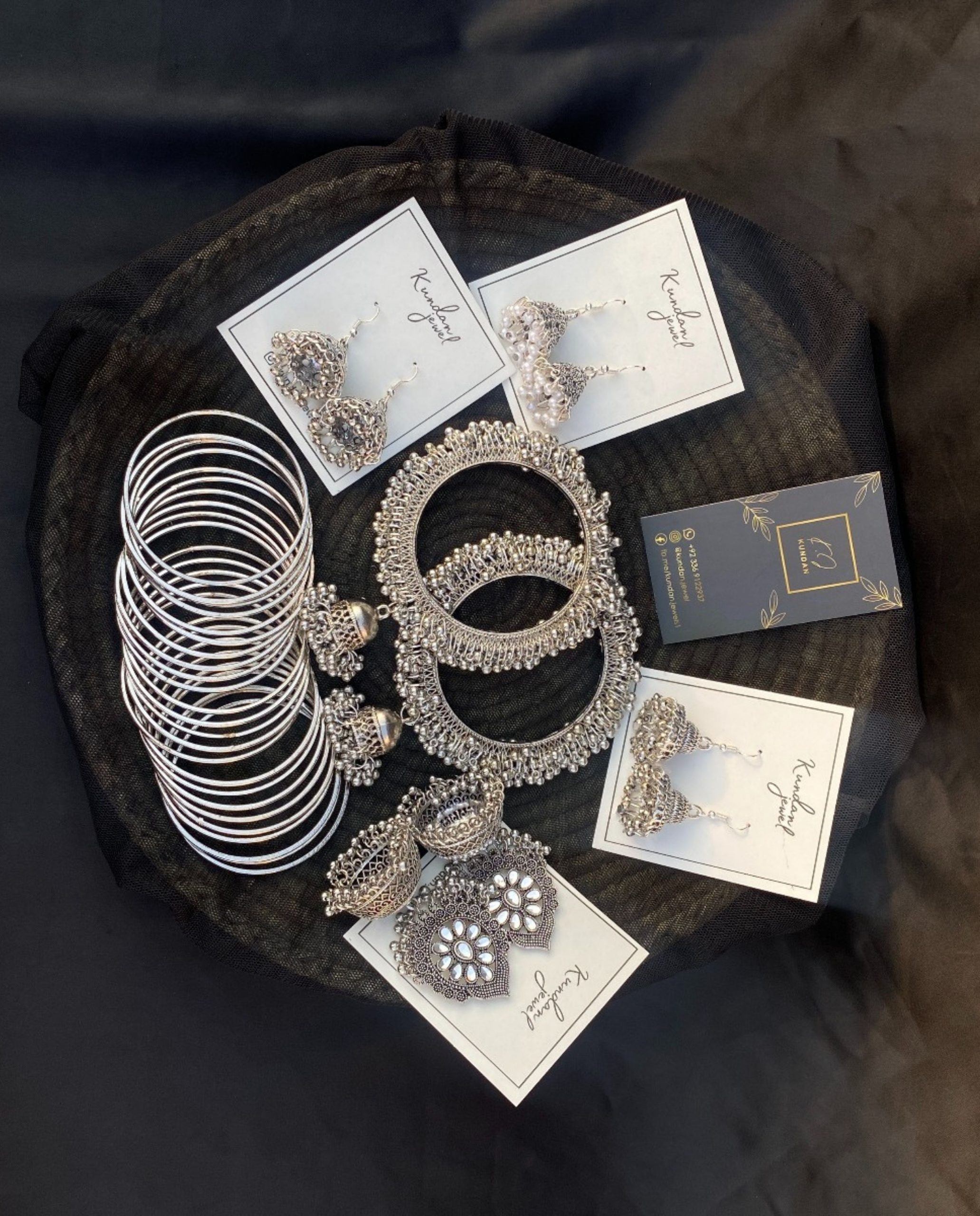 A graceful accessory set featuring beautiful jhumkas and a gajra bangle set — ideal for enhancing any traditional ensemble: