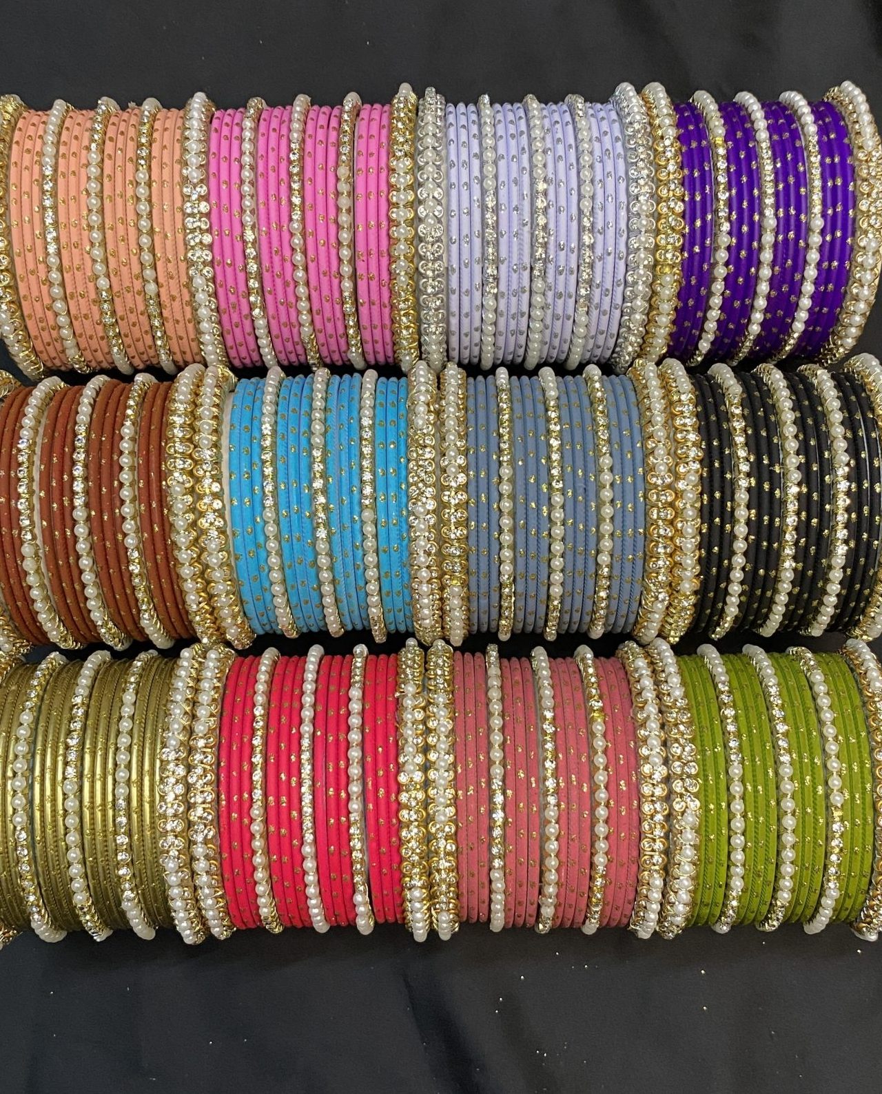 A fusion of luxury and vibrance, the Royal Prism Bangle Set features 12 exquisite bangles, each showcasing a distinct regal color such as emerald green, ruby red, sapphire blue, and golden amber. Some bangles feature subtle metallic beading, while others have a high-gloss enamel finish, creating a perfect balance of texture and shine. This set is ideal for grand celebrations, bridal wear, and festive occasions, offering an opulent charm to your ensemble.