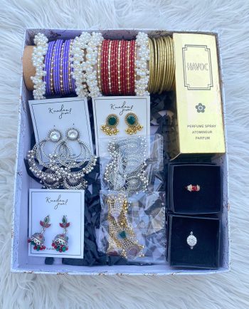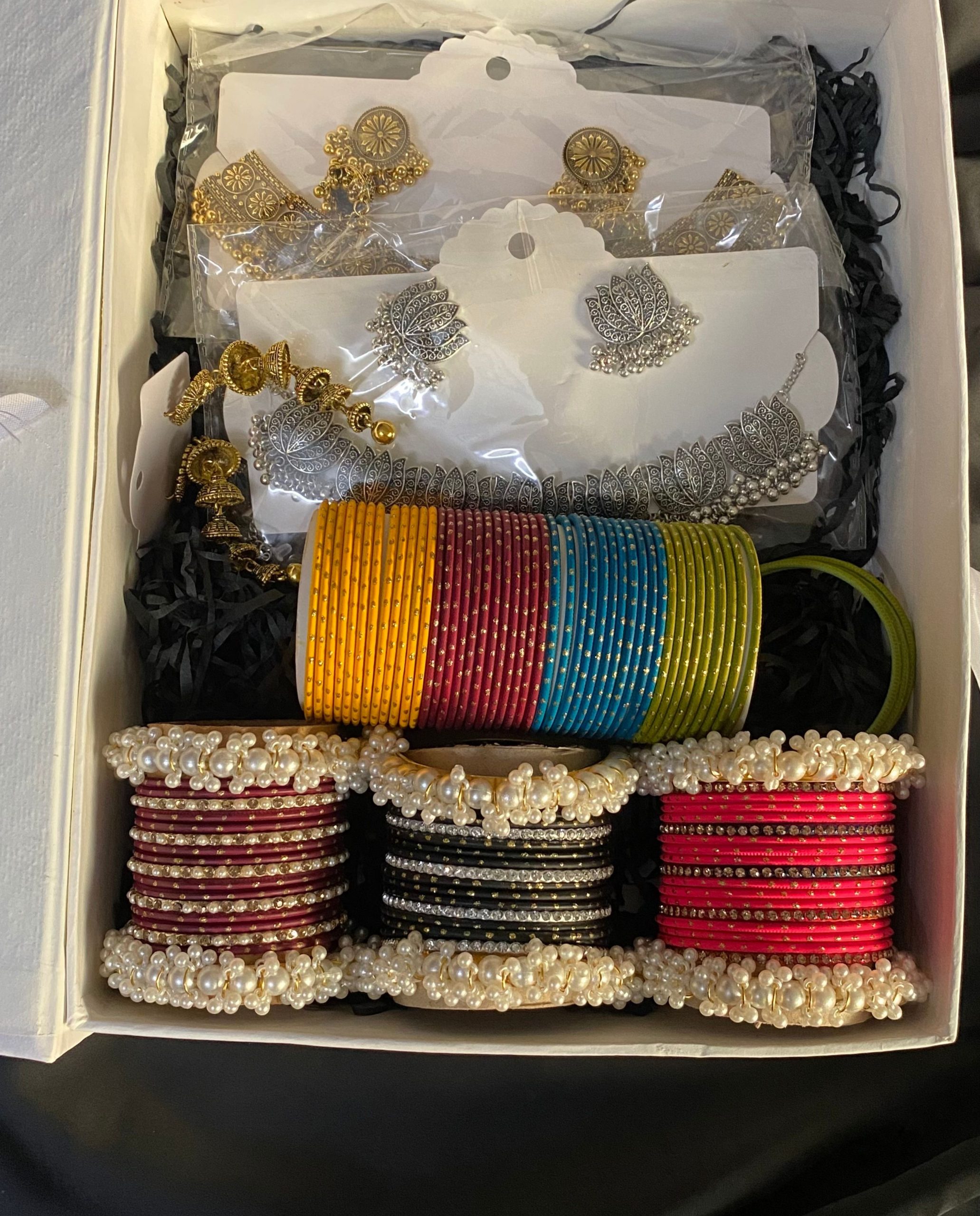 Two elegant chokers to elevate any look. A pair of statement jhumkas that add a traditional flair. Vibrant metal bangles in a variety of colors and classic bangle sets to complete the ensemble. Premium gift box with message card and decorative fillers for a luxurious presentation. This is a fully customized gift box, thoughtfully curated based on your budget and personal preferences.